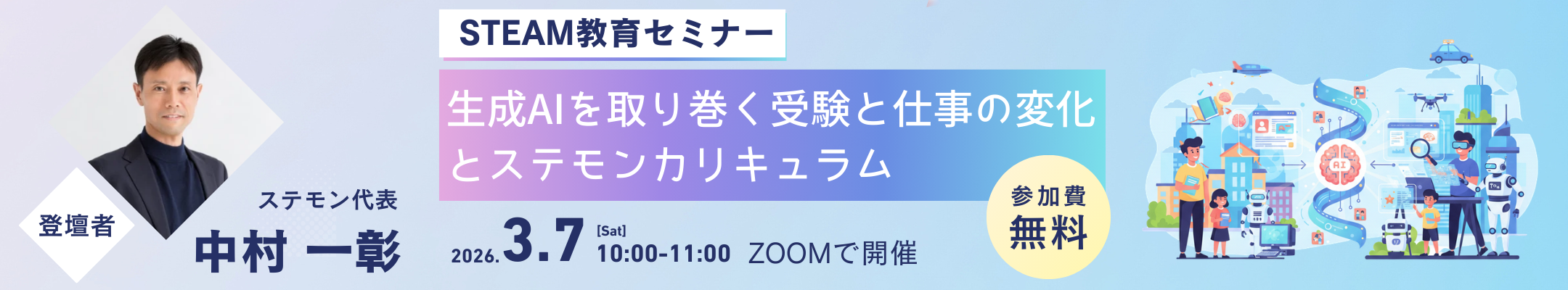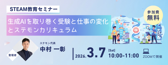 このたび、幼児・小学生のお子さまをお持ちの保護者の方に向けて、 「生成AIを取り巻く受験と仕事の変化とステモンカリキュラム」というセミナーを開催いたします。 生成AIの目覚ましい進化によって、受験や仕事も大きく変化しています。 そんな激動の時代を生きていく子どもたちに学んでほしい「ステモン」の教育理念、育てたい人物像、カリキュラムについて、ステモンの代表が語ります。
